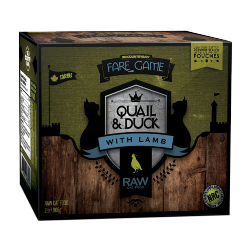 A blend of Ontario duck and quail meat and bone, with lamb organ meats, barley grass, and wheatgrass. Packaged in ½ lb portions each 2 lb carton contains 4 vacuum-sealed packs.